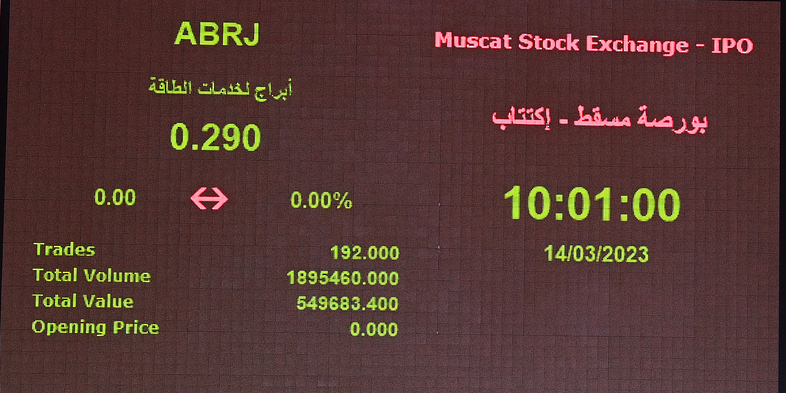 احتفلت بورصة مسقط اليوم بإدراج وبدء تداول أسهم شركة “أبراج لخدمات الطاقة” التي تعد أول شركة في قطاع النفط تدرج في البورصة وأول شركة تخضع للاكتتاب العام الأولي ضمن خطة التخارج التي يقودها جهاز الاستثمار العُماني.