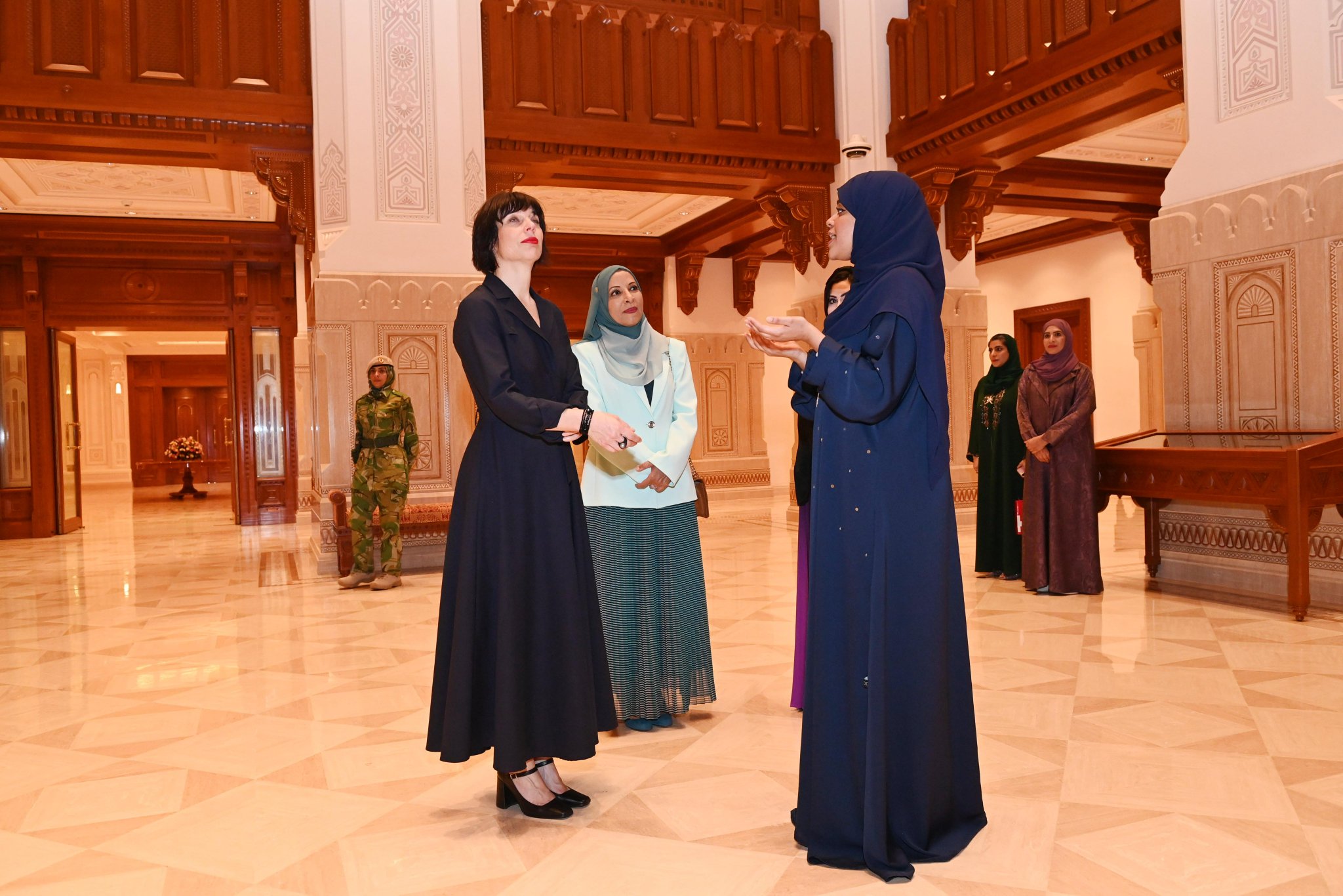 الدكتورة مورييل زيندر بيرسيه حرمُ فخامة رئيس الاتحاد السويسري تطّلع خلال زيارتها دار الأوبرا السُّلطانية مسقط على الثراء المعماري للدّار، والتصميم الهندسي الذي يمزج بين الإرث الثقافي العُماني ومختلف ثقافات قارات العالم.