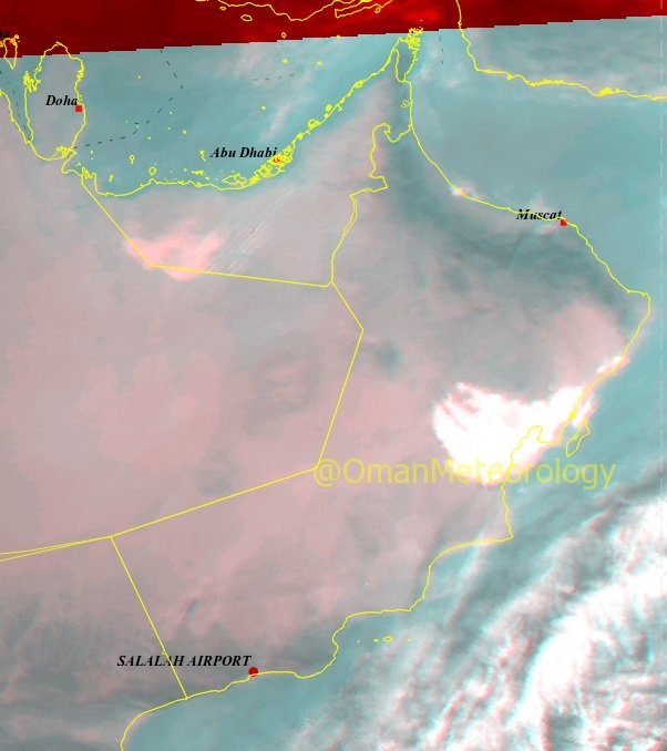 الصورة الجوية الآن توضح انتشار السحب المنخفضة على أجزاء من السواحل المطلة على بحر عمان وسواحل بحر العرب