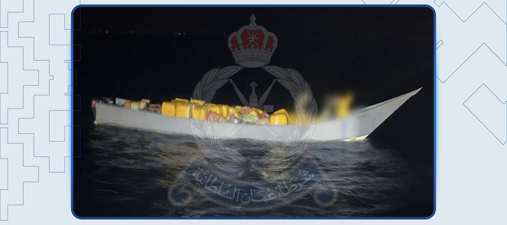 ألقت شرطة خفر السواحل بقيادة شرطة محافظة ظفار القبض على 5 أشخاص من الجنسية اليمنية أثناء دخولهم البحر الإقليمي العماني بطريقة غير مشروعة ومحاولة تهريب كميات من المخدرات إلى البلاد عبر قارب صيد بقصد الاتجار بها، وتُستكمل الإجراءات القانونية بحقهم.