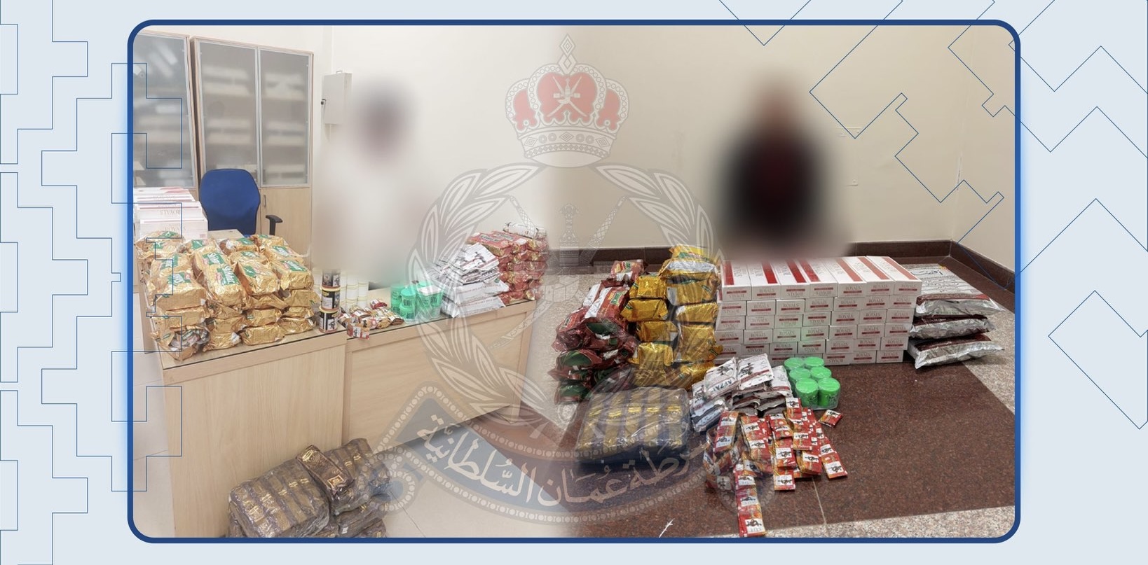 ألقت قيادة شرطة محافظة الداخلية القبض على شخصين من جنسية آسيوية وبحوزتهما كميات كبيرة من السجائر والتبغ الممنوع في ولايتي منح وسمائل بقصد الاتجار بها، وتُستكمل الإجراءات القانونية بحقهما.