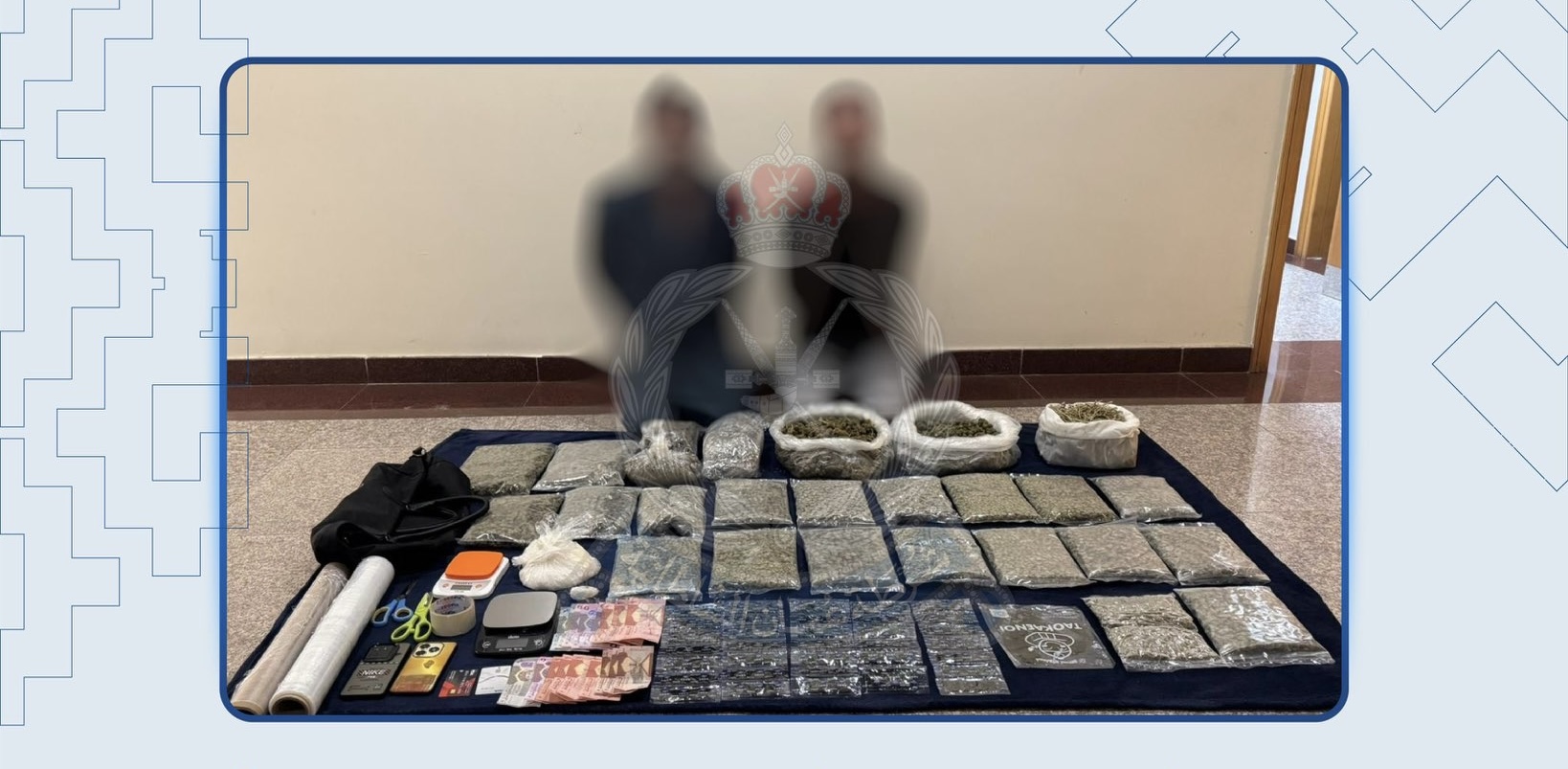 ألقت إدارة مكافحة المخدرات والمؤثرات العقلية بقيادة شرطة محافظة مسقط القبض على شخصين من جنسية آسيوية في ولاية السيب وبحوزتهما كميات من مخدر الماريجوانا والكريستال، بقصد الاتجار والتعاطي، وتُستكمل الإجراءات القانونية بحقها.