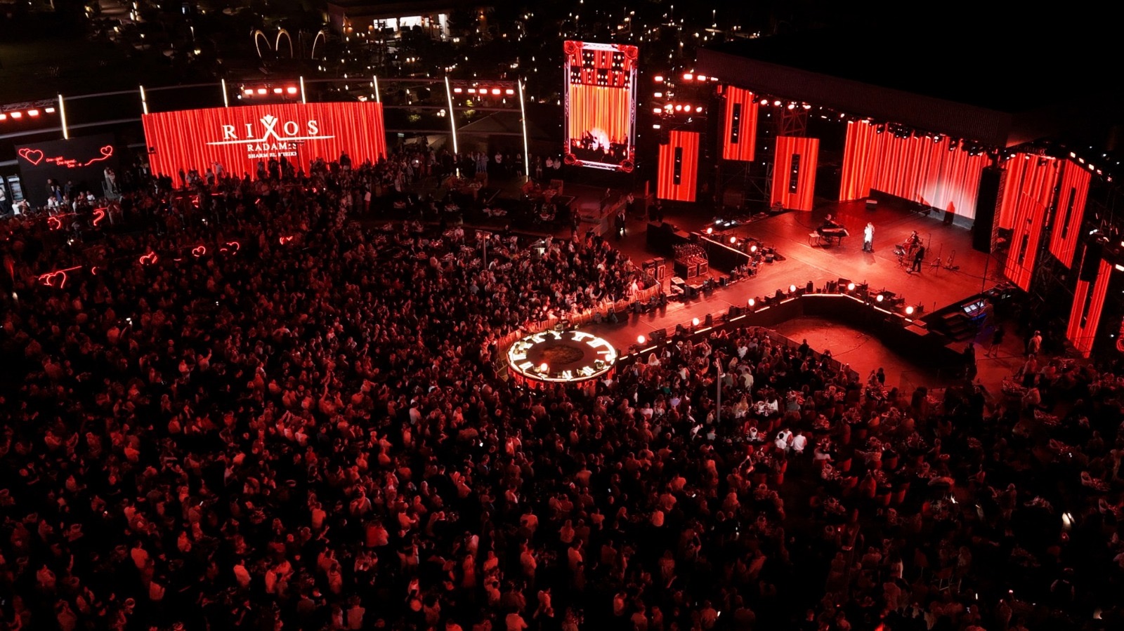 وقد تحوّلت جميع فنادق ريكسوس في شرم الشيخ، إلى جانب موقع الحفل، إلى لوحة رومانسية متكاملة بطابع يوم الحب؛ حيث زُيّنت المساحات بديكورات أنيقة باللونين الأحمر والذهبي، وممرات مضاءة بالشموع، وتنسيقات زهور فاخرة، وعناصر تصميمية مُبهرة، خلقت أجواءً ساحرة في مختلف أرجاء المنتجعات. واصطف الضيوف في طوابير طويلة قبل انطلاق الحفل، في انتظار دخول المسرح المفتوح المذهل المطلّ على خلفية البحر الأحمر الخلابة.