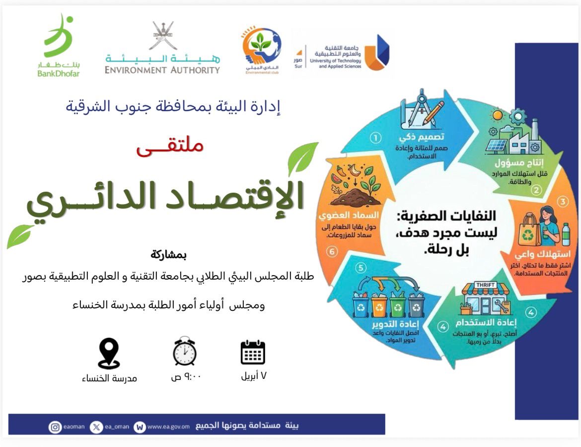 نظّمت إدارة البيئة بمحافظة جنوب الشرقية ملتقى توعويًا بعنوان “الاقتصاد الدائري”، وذلك في مدرسة الخنساء للتعليم الأساسي، بمشاركة طلبة المجلس البيئي بجامعة التقنية والعلوم التطبيقية بصور، إلى جانب مجلس أولياء أمور الطلبة بالمدرسة، وبحضور عدد من الكوادر التعليمية والطالبات.
