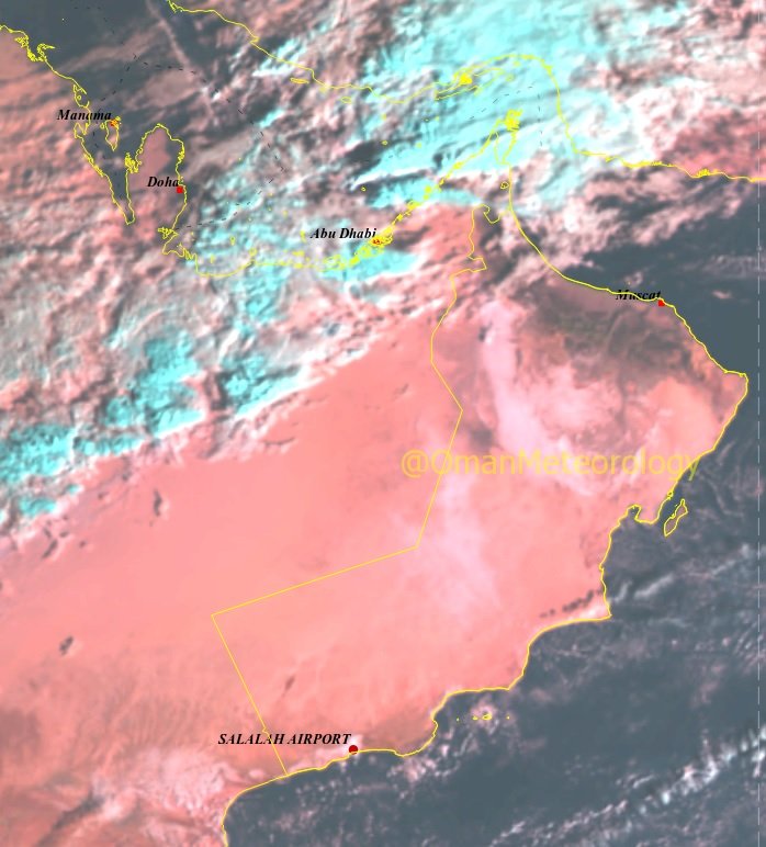 الصورة الجوية توضح استمرار تدفق وتكثف السحب الماطرة على محافظتي مسندم وشمال الباطنة وأجزاء من محافظة البريمي كما تتواجد السحب المنخفضة والضباب على أجزاء من محافظات الداخلية والظاهرة والوسطى وأجزاء من سواحل بحر عمان مع هطول أمطار متفرقة على سواحل ظفار