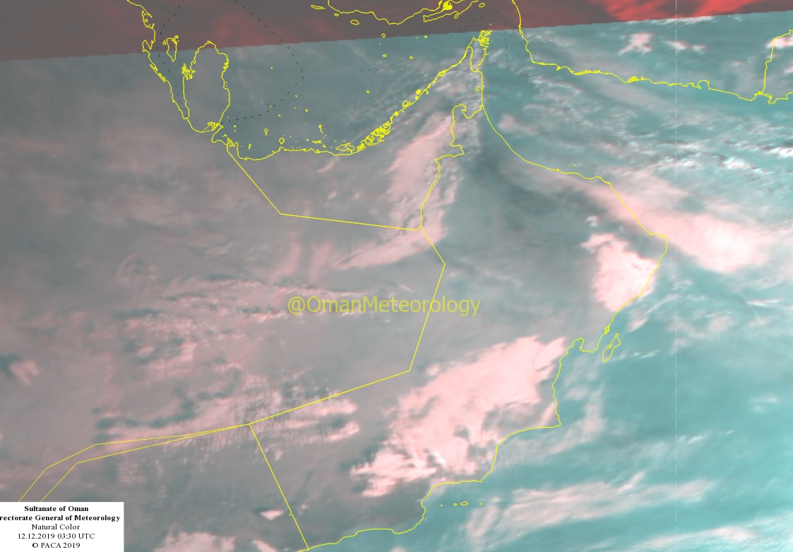 آخر الصور الجوية توضح انتشار السحب المنخفضة والضباب على أجزاء من محافظات البريمي والظاهرة وجنوب الشرقية والوسطى وظفار