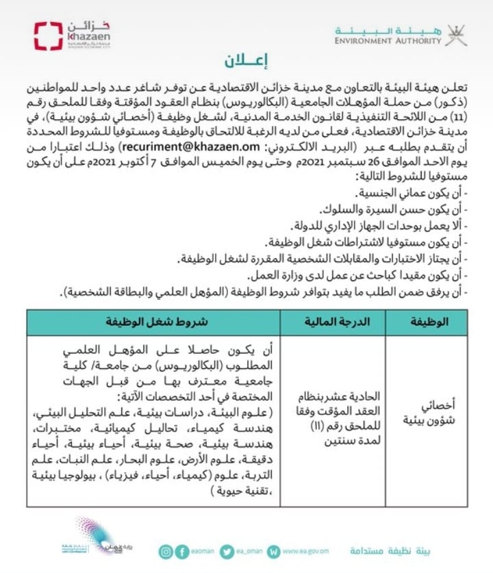 أعلنت هيئة البيئة وبالتعاون مع مدينة خزائن الاقتصادية عن رغبتها بتعيين لديها “أخصائي شؤون بيئية”.