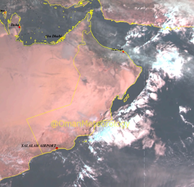 تواجد السحب على سواحل محافظتي الوسطى وظفار مع فرص هطول أمطار متفرقة مع انتشار السحب على أجزاء متفرقة من سواحل بحر عمان