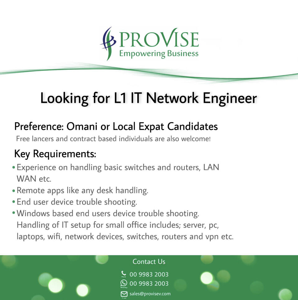 أعلنت شركة بروفايز عن رغبتها بتعيين لديها مهندس شبكات تكنولوجيا المعلومات.