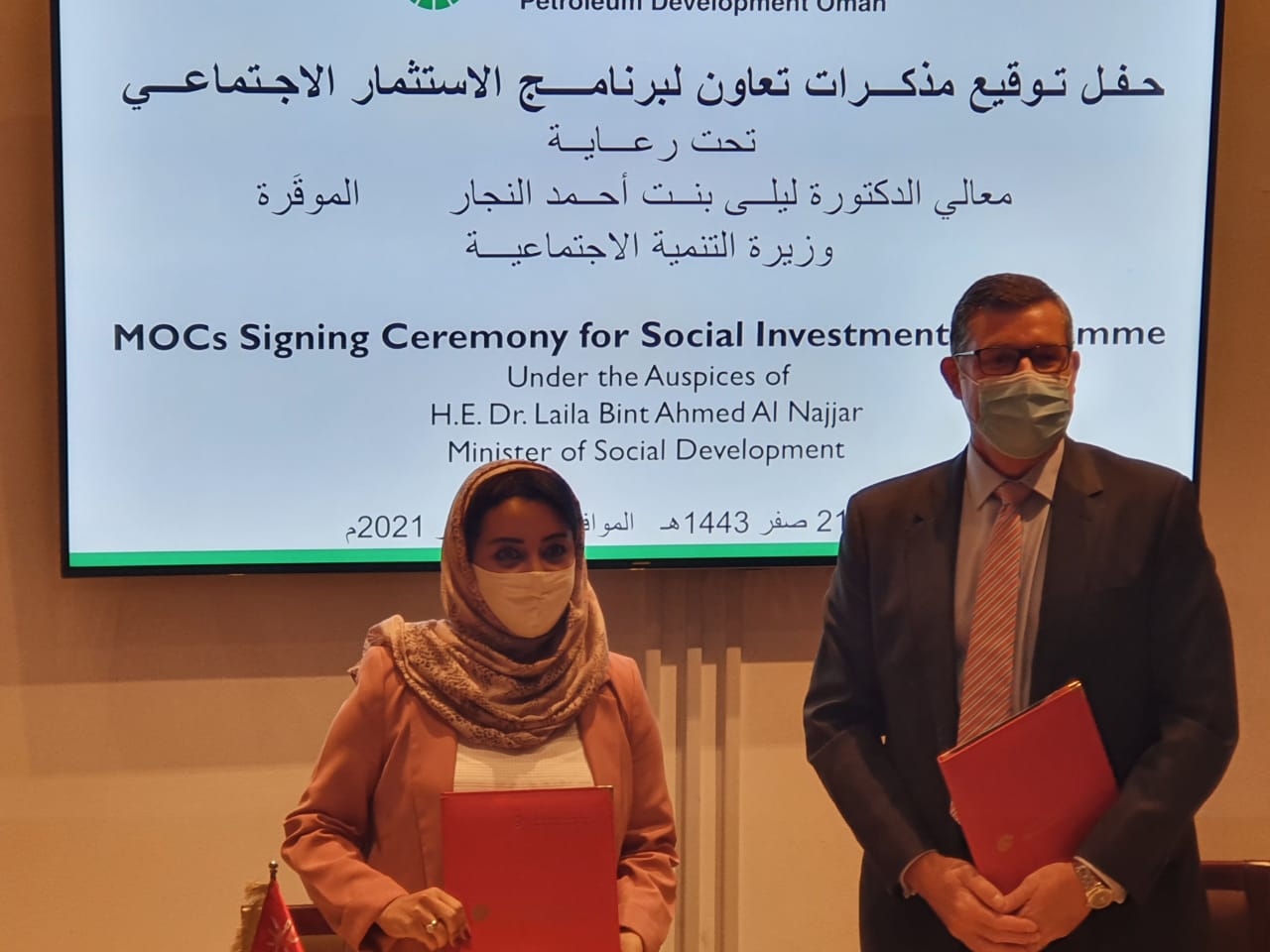 رعت معالي الدكتورة ليلى بنت أحمد بن عوض النجار، وزيرة التنمية الاجتماعية، اليوم (28 سبتمبر) التوقيع على مذكرات تعاون لمبادرات برنامج الاستثمار الاجتماعي في شركة تنمية نفط عُمان، وذلك في حفل رسمي أقيم في مركز عالم المعرفة التابع للشركة في مسقط.
