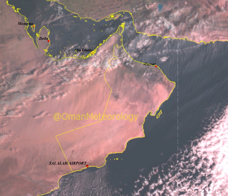 الصورة الجوية توضح تدفق السحب على أجزاء من المحافظات الشمالية للسلطنة مع فرص هطول أمطار متفرقة على محافظة مسندم