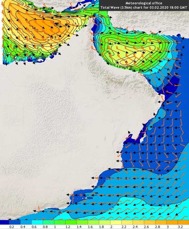 ارتفاع موج البحر على سواحل بحر عمان و محافظة مسندم تدريجيا من متوسط إلى هائج الموج (2.5-3.0)متر نتيجة هبوب رياح شمالية غربية نشطة