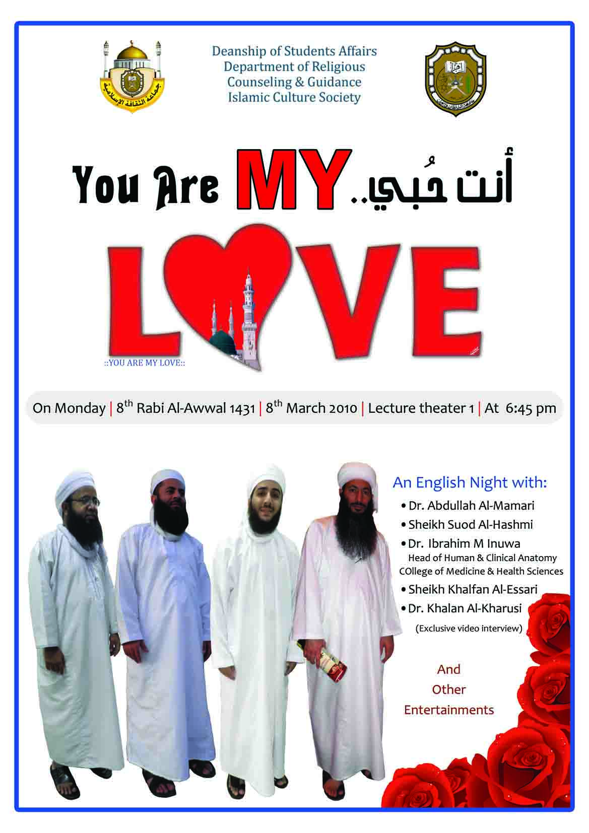 أنت حُبي..You are My Love الأمسية الانجليزية التي ستصحبكم فيها –بإذن الله- جماعة الثقافة الإسلامية بجامعة السلطان قابوس مساء يوم الاثنين المقبل بتاريخ 8-3-2010 في قاعة المحاضرات 1 الساعه 06:45.