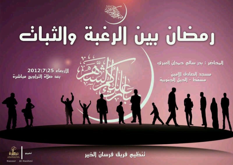 سَتنطَلق أَولى فَعالِيات فَريق فُرسان الخَير وهَو فَريق اجتماعي تَطوعِي، والفَعاليِة سَتكون مُحاضَرة بِعنوان" رَمضان بِين الرَغبةِ والثَبات"، يُلقِيها الشِيخ المُحاضَر بَدر بِن سالم العَبري، فِي مَسجد الصادِق الأَمين" مَسقط – الحِيل الجَنوبِية"، بِتارِيخ 25 يولِيو 2012 الموَافق الخامِس مِن شَهر رَمضان المُبارك.
