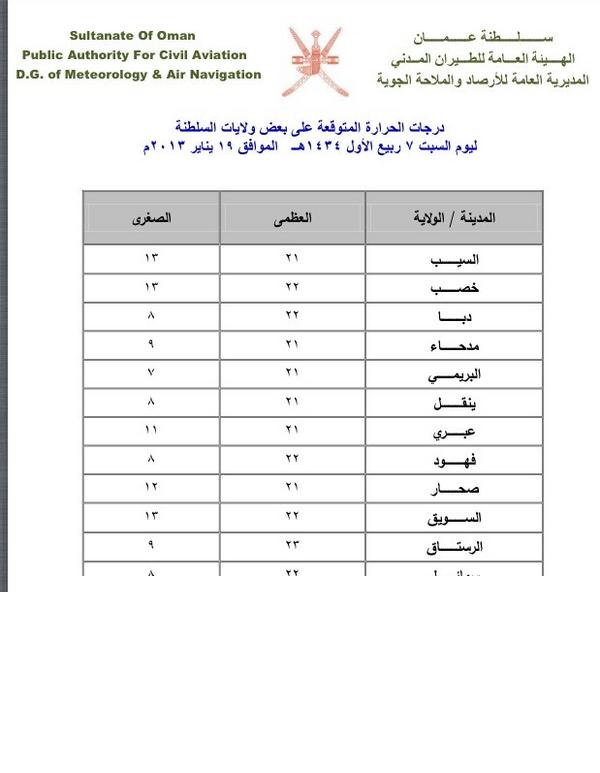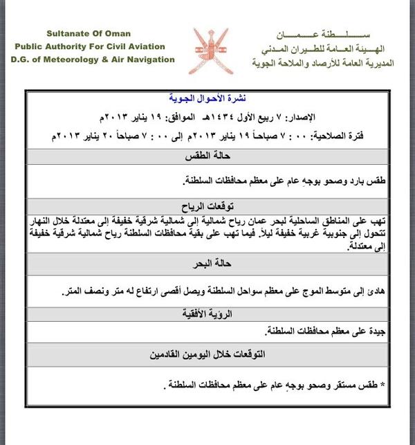 حالة الطقس المتوقعة لنهار اليوم السبت الموافق 19/1/2013