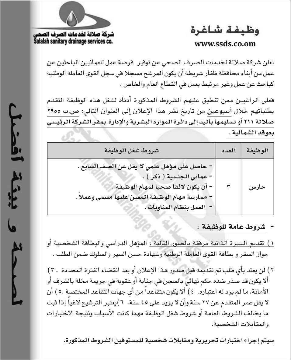 [الاربعاء 29-8-2012] فرص عمل شاغره في شركة صلاله لـ خدمات الصرف الصحي