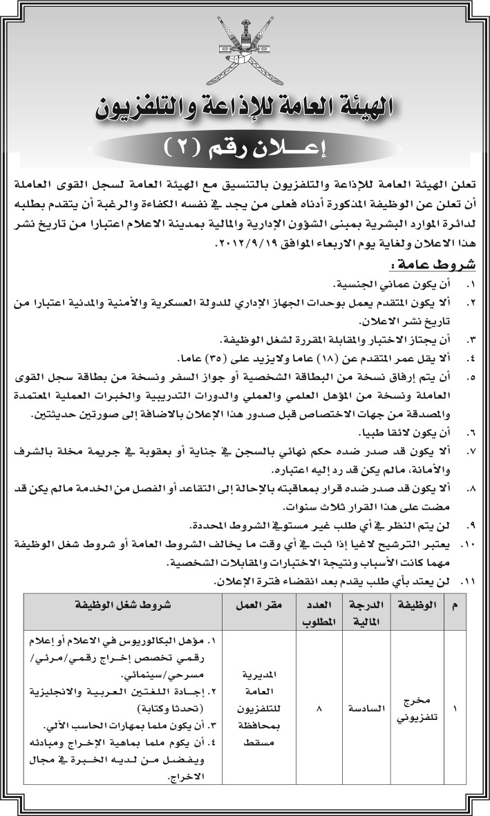[الاربعاء 5-9-2012] الهية العامه للاذاعه والتلفزيون .. وظيفة مخرج تلفزيوني