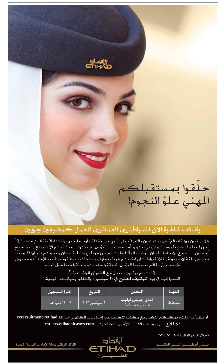 اليوم السبت 15/9/2012..الإتحاد للطيران..إعلان لوظيفة مضيف جوي