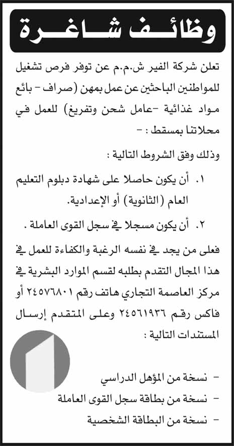 • الأربعاء 2 / 4 / 2014 - شركة الفيـــــــر - وظائف شاغرة