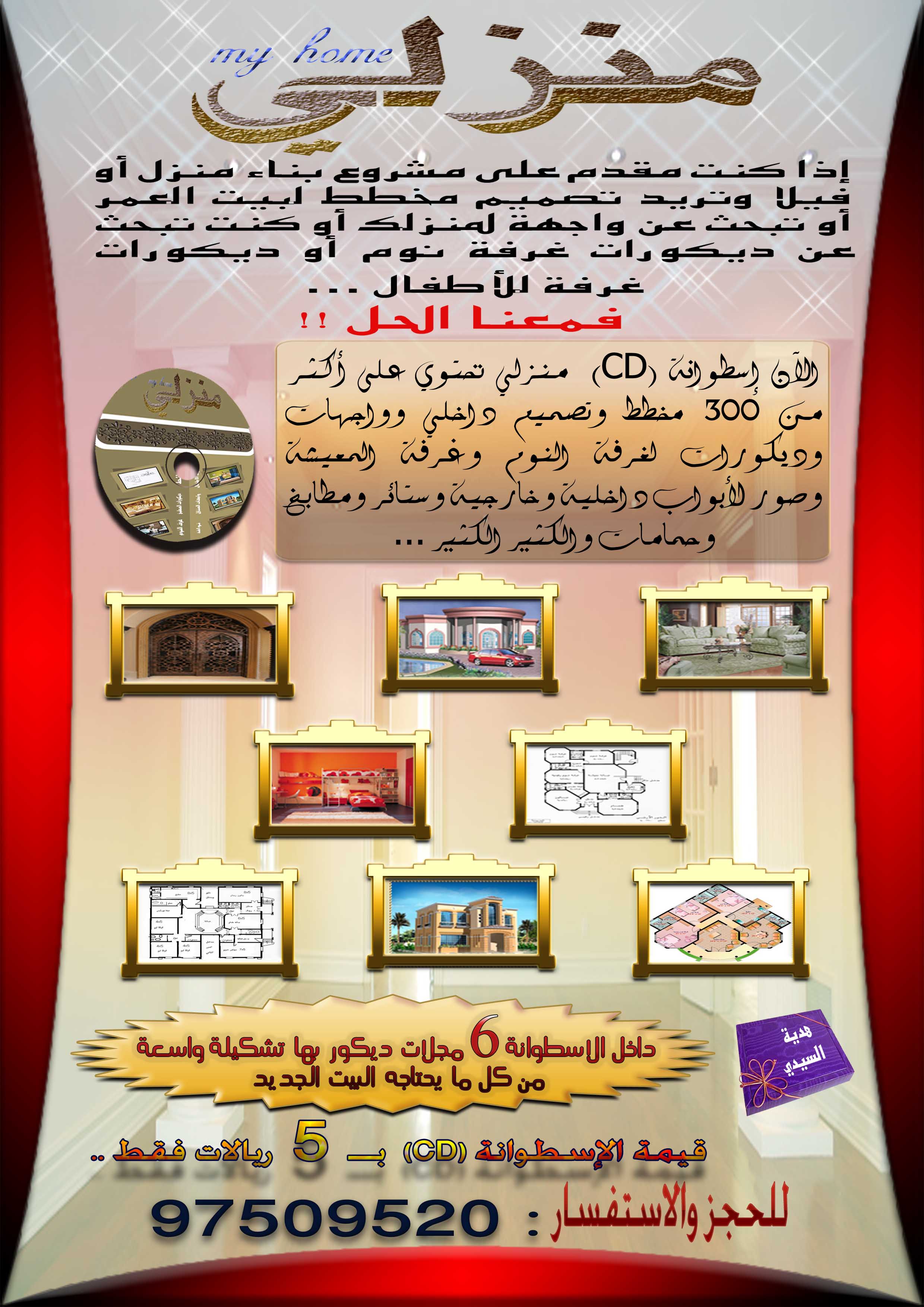السلام عليكم الى كل من أعياه البحث عن مخططات هندسية مختلفة مع واجهات بعضها لن تجدها الإ على هذه الإسطوانة وصور لأحدث الديكورات العصرية وصور للأبواب الداخلية والخارجية).. تحتوي على كل ما يفيدك في تحقيق حلمك وبناء بيت الاحلام الذي تفكر به .. لا داعي للقلق بعد اليوم واترك عنك عناء التفكير والبحث في كيفية انشاء بيتك